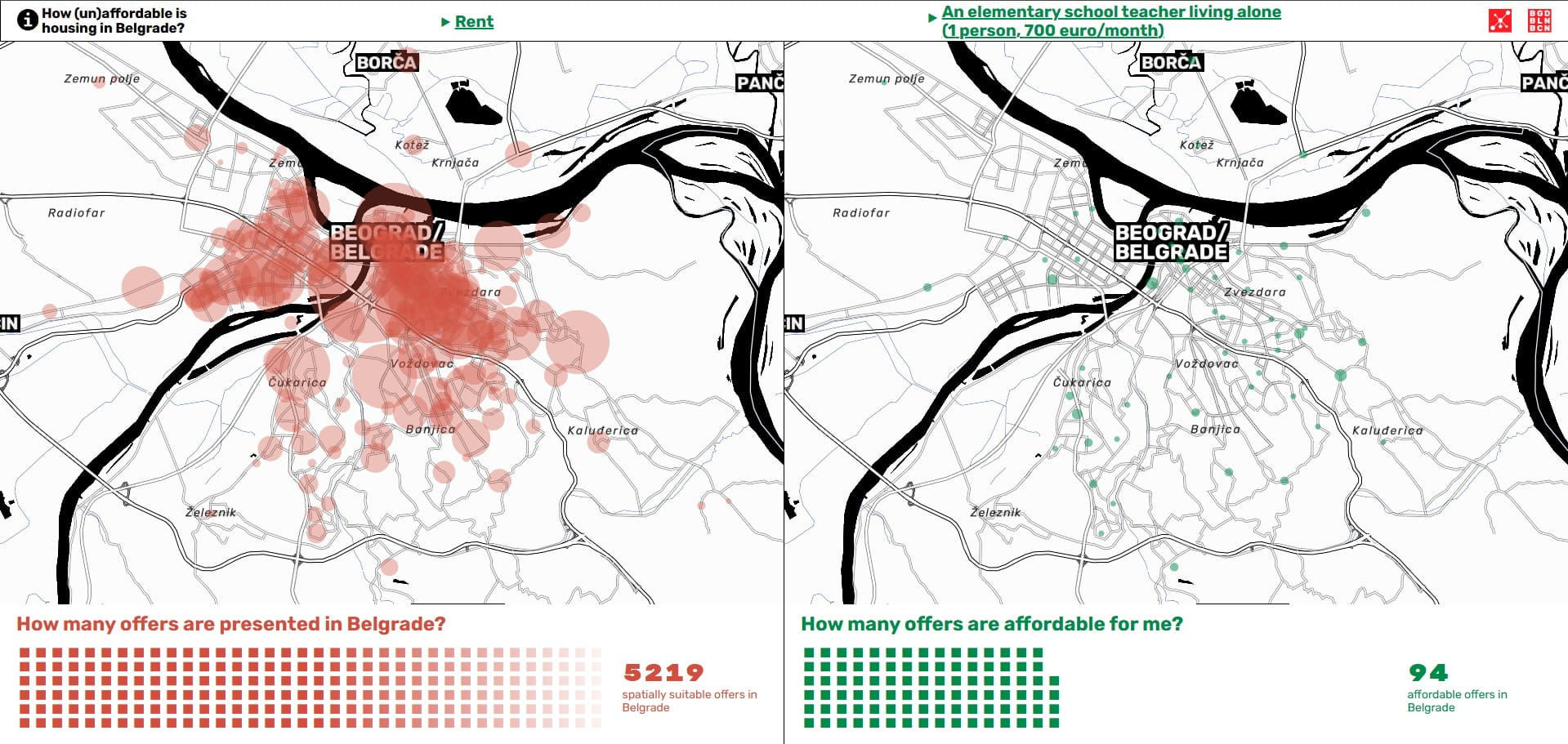 Ministria e Hapësirës, një organizatë joqeveritare me bazë në Beograd, me specializim në zhvillimin urban, krijoi një hartë me burim të hapur, e cila mbledh njoftime për qiradhënie dhe shitje në tregun e Beogradit dhe i krahason me pagat mesatare dhe mediane.